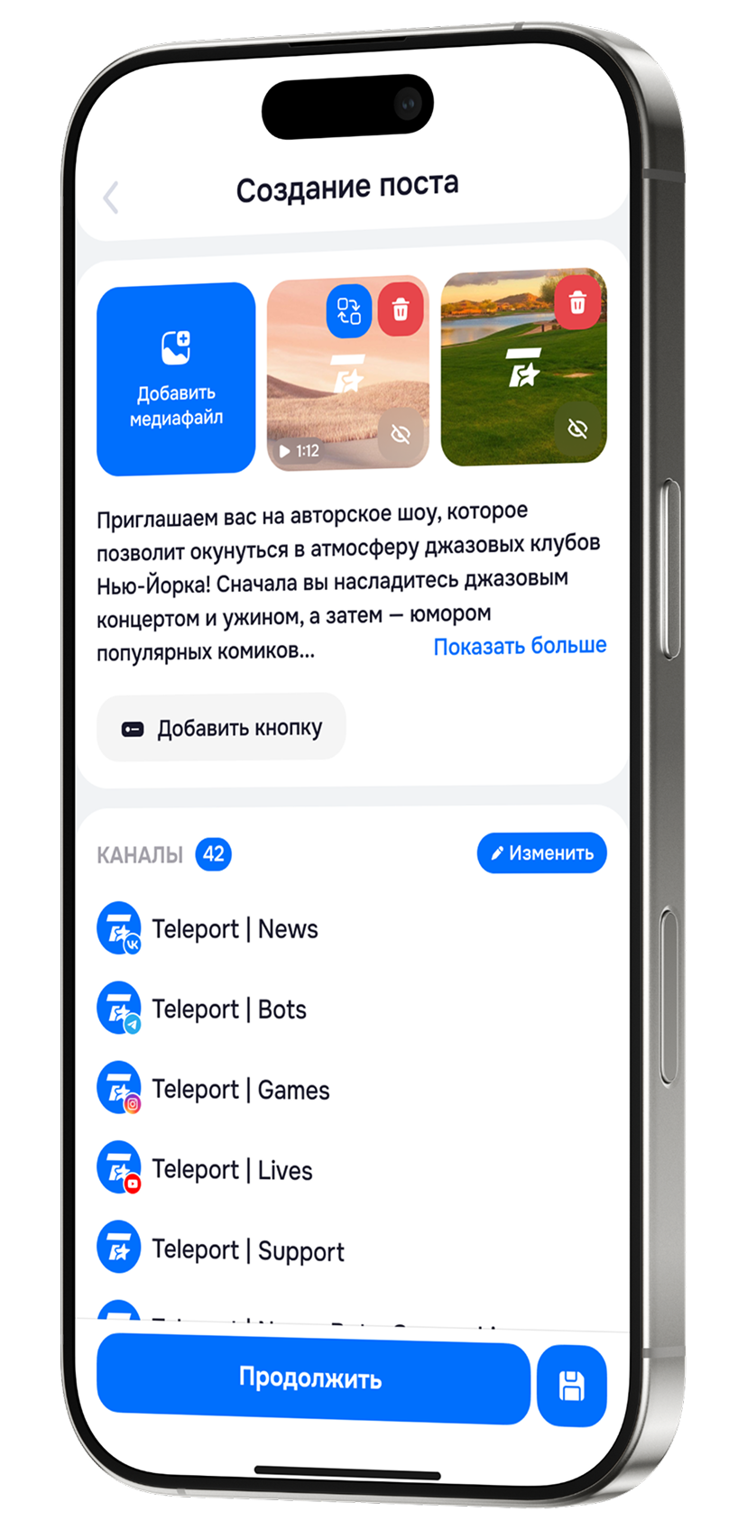 Teleport объединяет всё: планирование и публикацию в Telegram и Instagram — в одном месте, мгновенно и синхронно.